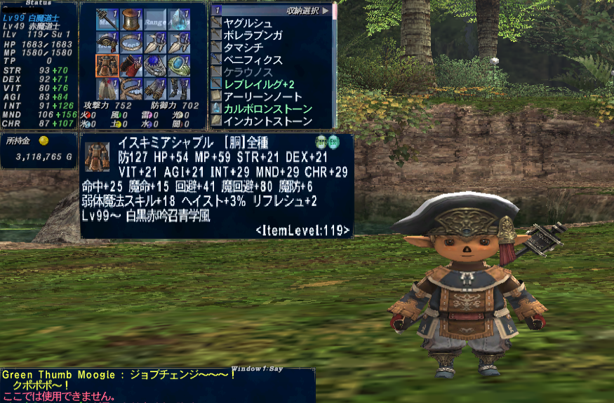 イスキミアシャブル:胴◆防127 HP+54 MP+59 STR+21 DEX+21 VIT+21 AGI+21 INT+29 MND+29 CHR+29 命中+25 魔命+15 回避+41 魔回避+80 魔防+6 弱体魔法スキル+18 ヘイスト+3% リフレシュ+2 IL:119 白黒赤吟召青学風 Lv99 RaEx